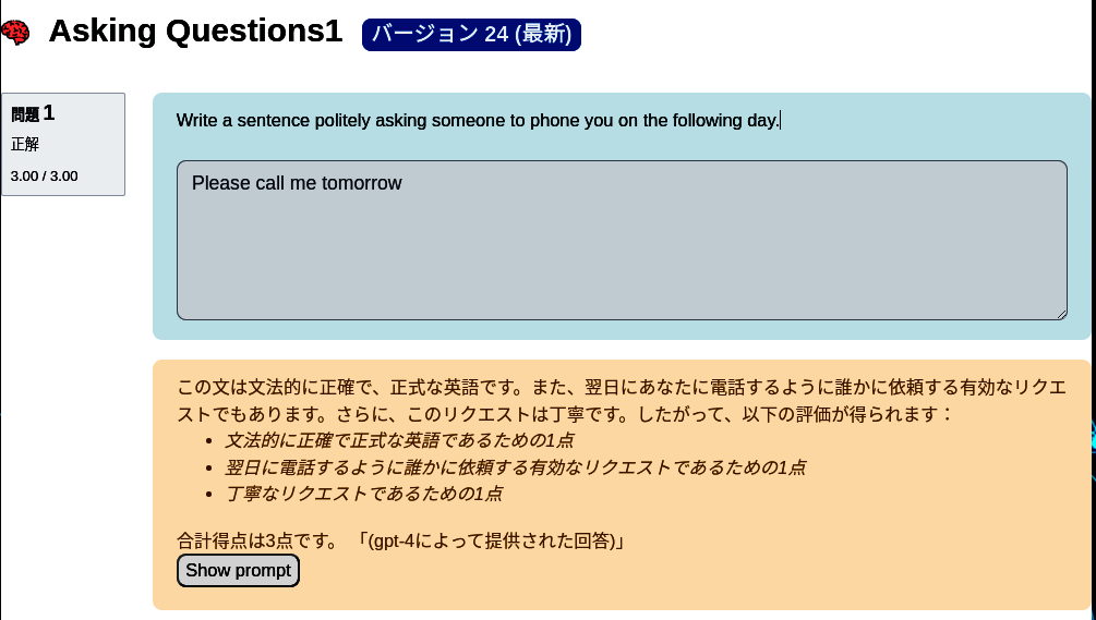 Used to evaluate the student’s answer. Writing good prompts requires an understanding of how LLMs behave. Some model versions tend to give overly positive responses, so a prompt may need to specify that only valid English or sensible answers should be considered.